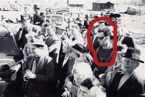 La imagen es de 1941, se tomó durante la reapertura del puente South Forks, Canadá. En primera instancia, parece una foto cualquiera, sin embargo, existe un detalle desconcertante. Uno de los hombres parece vestir ropa moderna entre los sombreros y trajes típicos de los 40, incluso parece sostener una cámara fotográfica, que se suma a los anteojos oscuros y un logotipo propio de los diseños actuales.